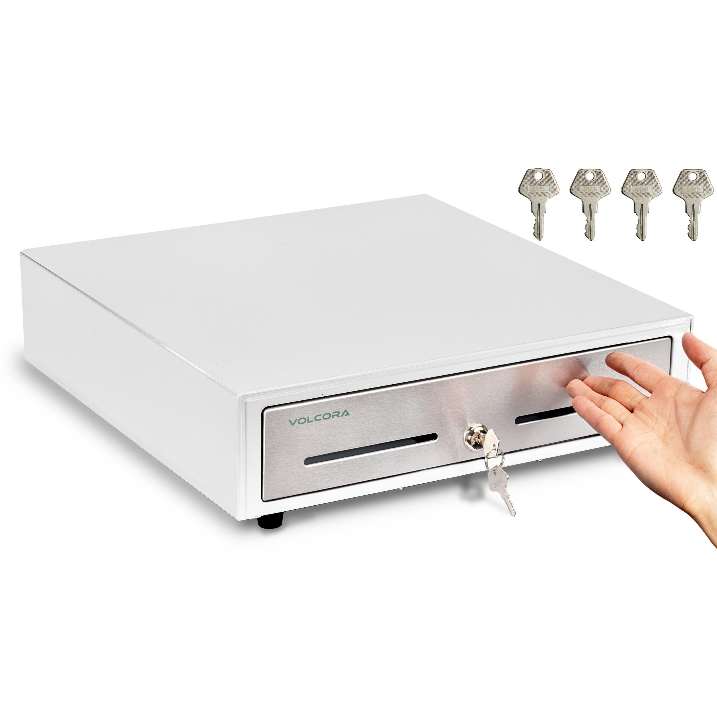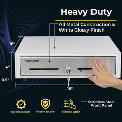 GREAT LOOKING DESIGN: This cashier register boasts a unique color combination of white and stainless steel front touch panel. Volcora point of sale cash drawer has a fully removable money tray that has 5 bills slots with stainless steel money clips, and a separate compartment of 8 coins slots to allow extra storage beneath it. Our cash drawers measure 16" x 16" x 4.5" (including feet).