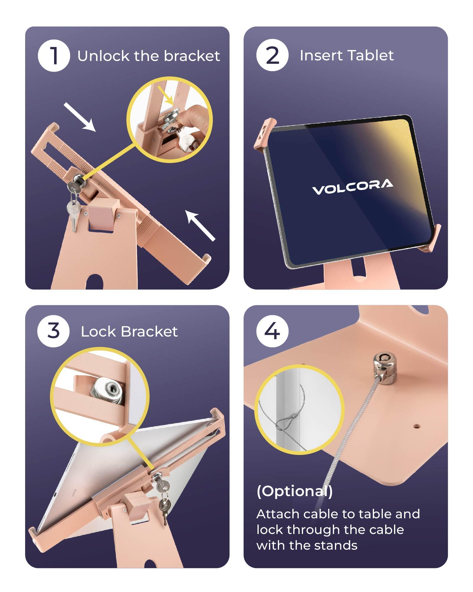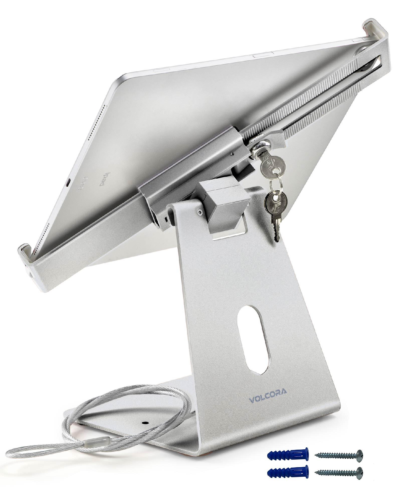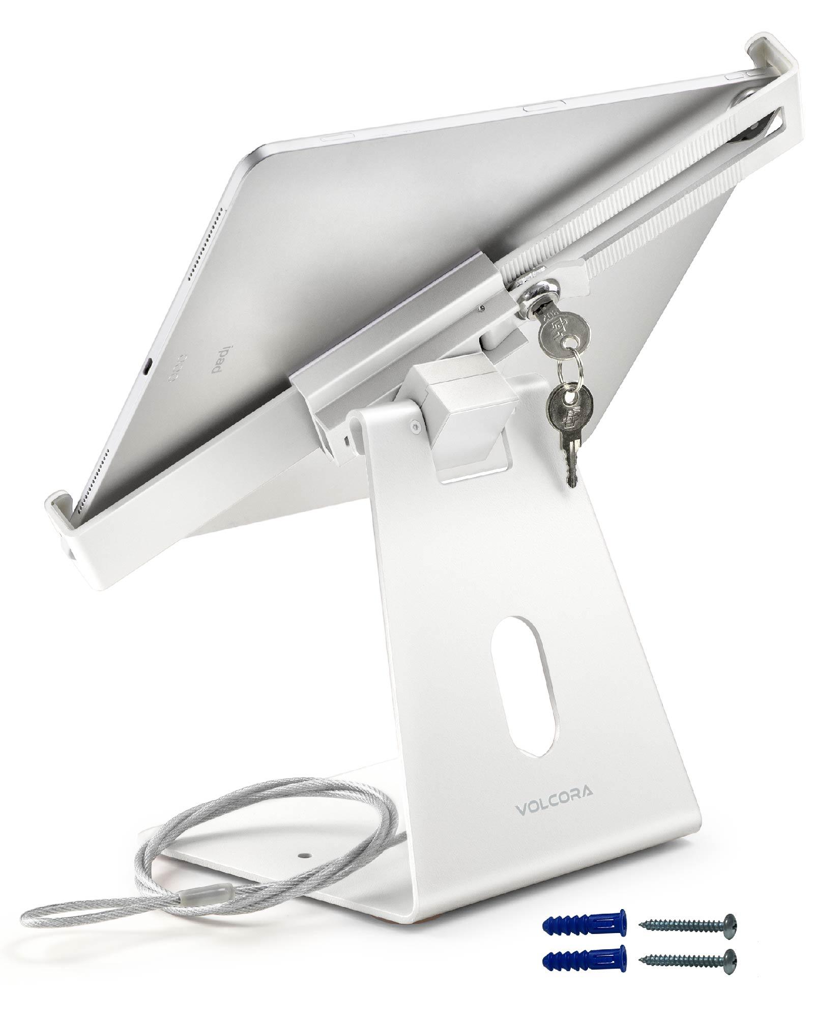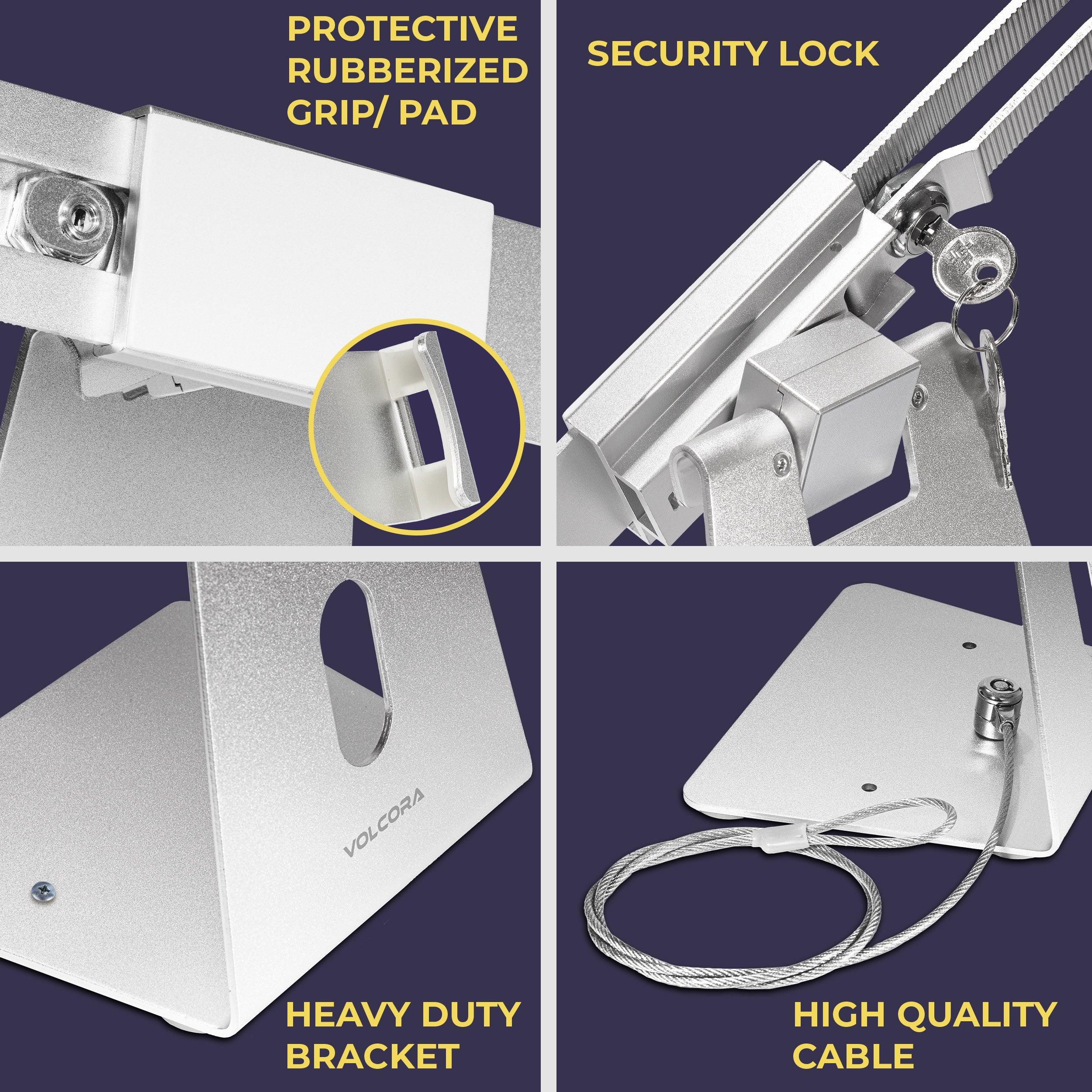 Volcora tablet iPad holder mount stand includes built in dual anti theft security lock on bracket and 4ft cable with lock to secure on a table or heavy objects. Included with 4 Keys: 2 on bracket, 2 on cable to prevent theft and increases security of the counter tablet holder.