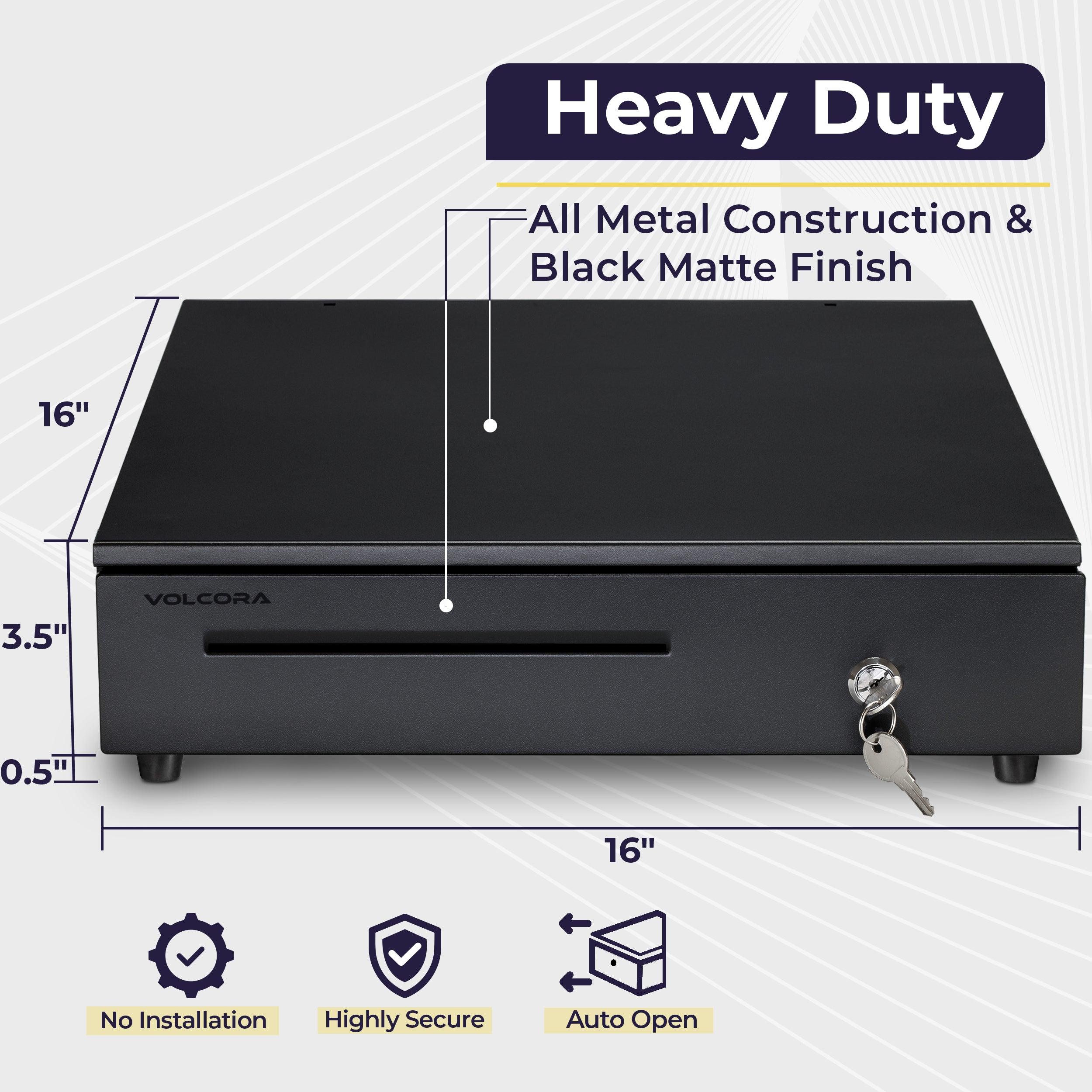 Volcora cash drawer model CD-5B is the perfect solution for applications that can be addressed with a heavy duty cash drawer. It is designed for the most rugged environments. It is also the cost effective choice that doesn't sacrifice quality or dependability. Model CD-5B is competitively priced and includes features, such as multifunction locks and drawer status reporting, found in more expensive cash drawers.