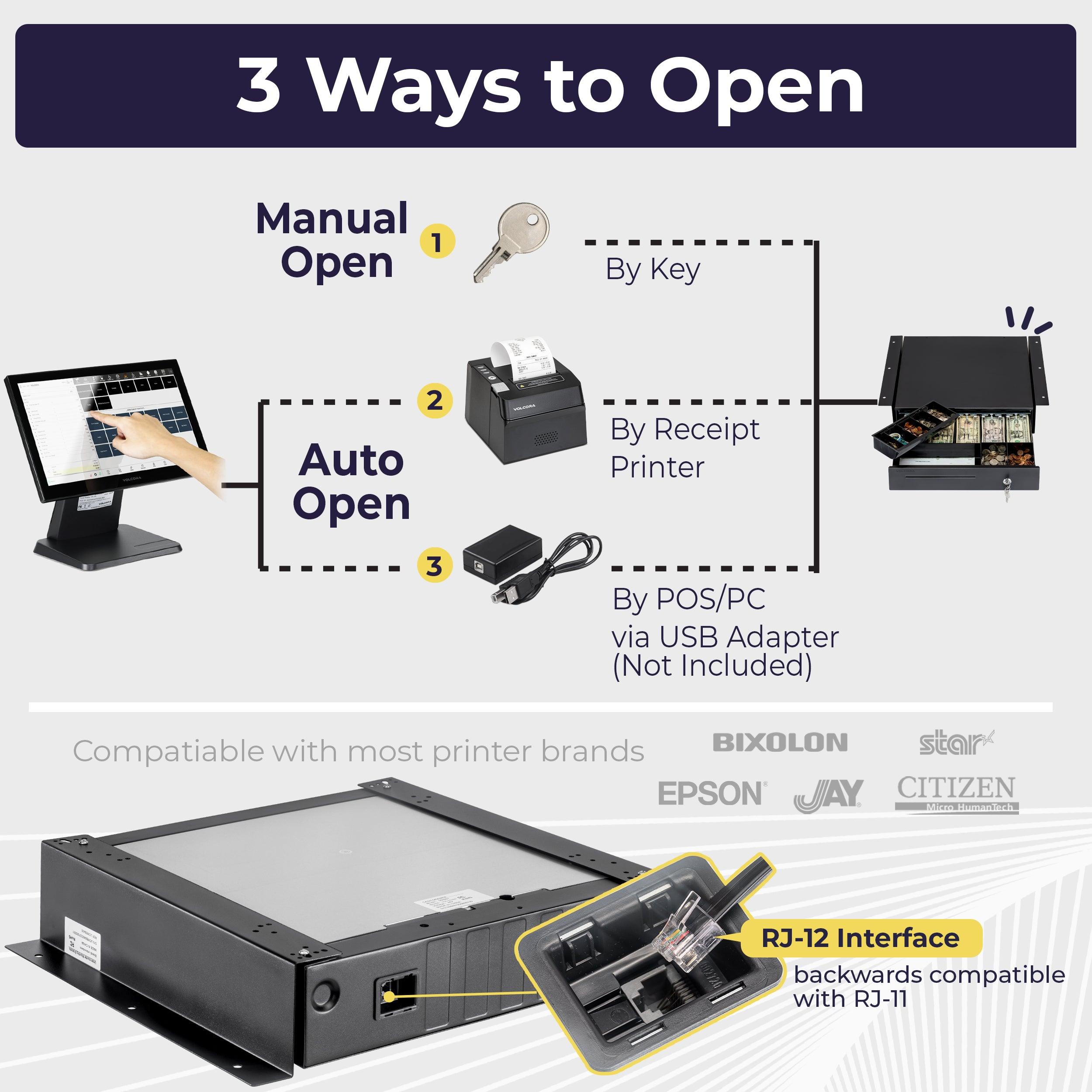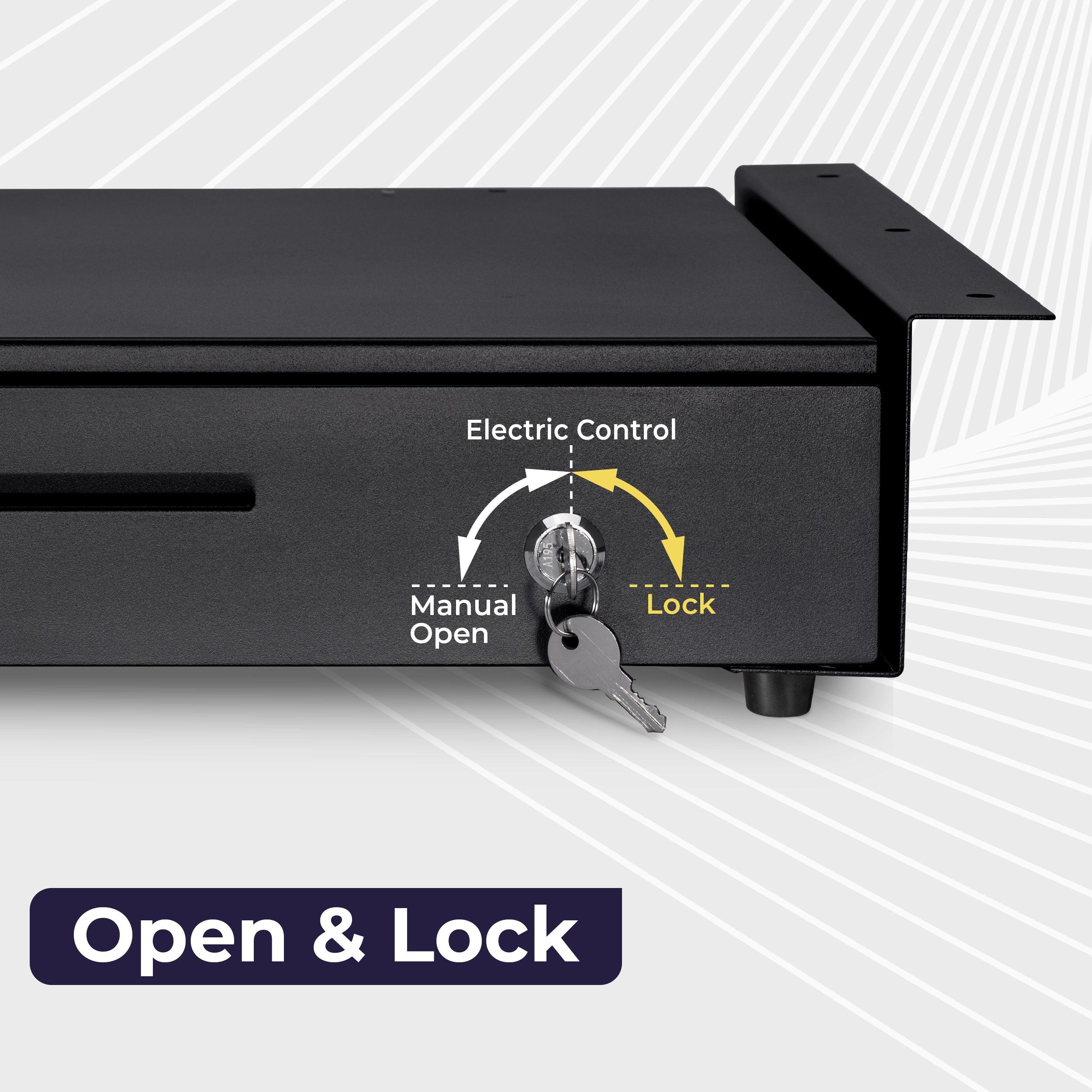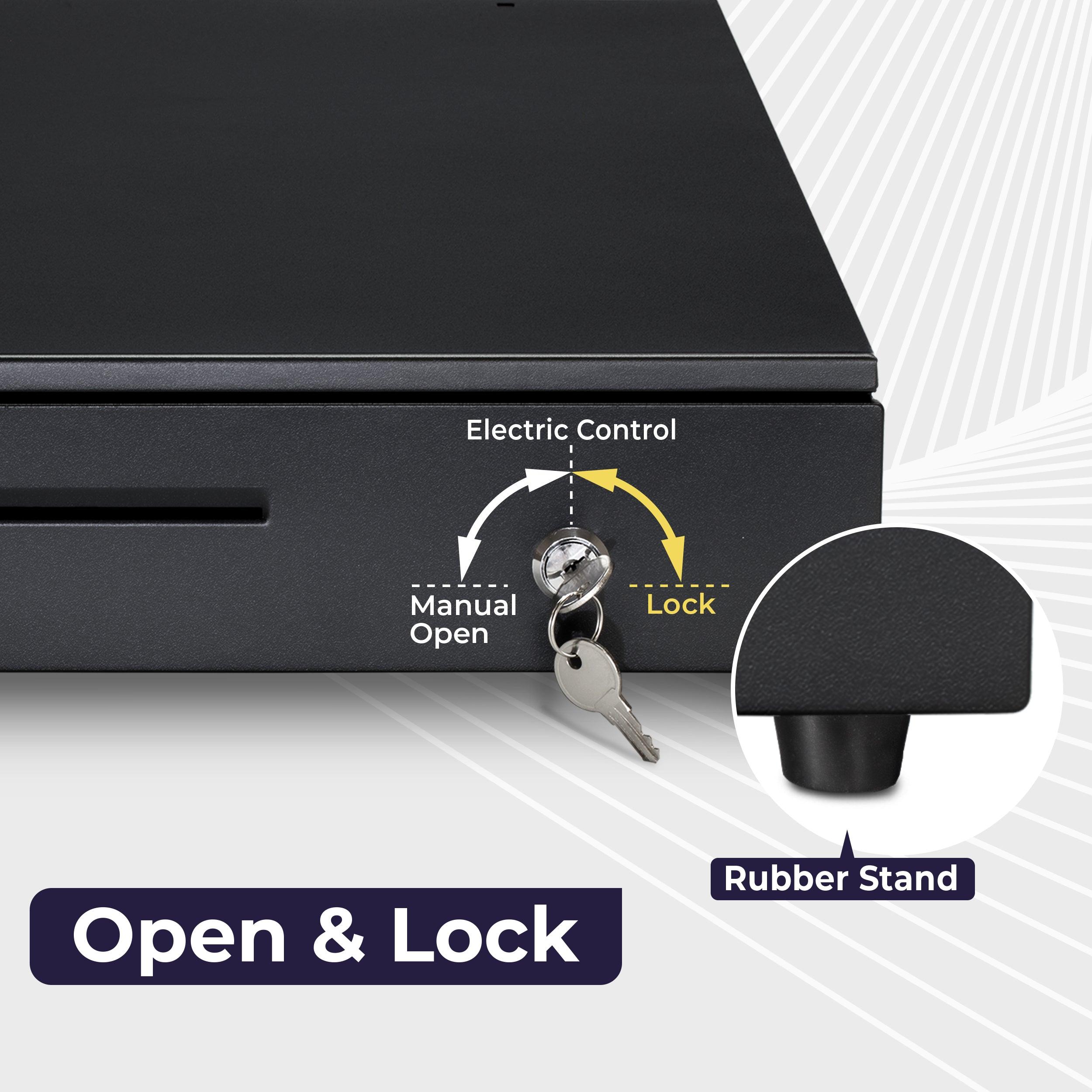 Interface: driven by receipt printer via RJ11/RJ12 (Drawer Kick interface or DKD)</li> <li>Lock: 3 position: 1-manual open, 2-auto open by printer/POS, 3-lock