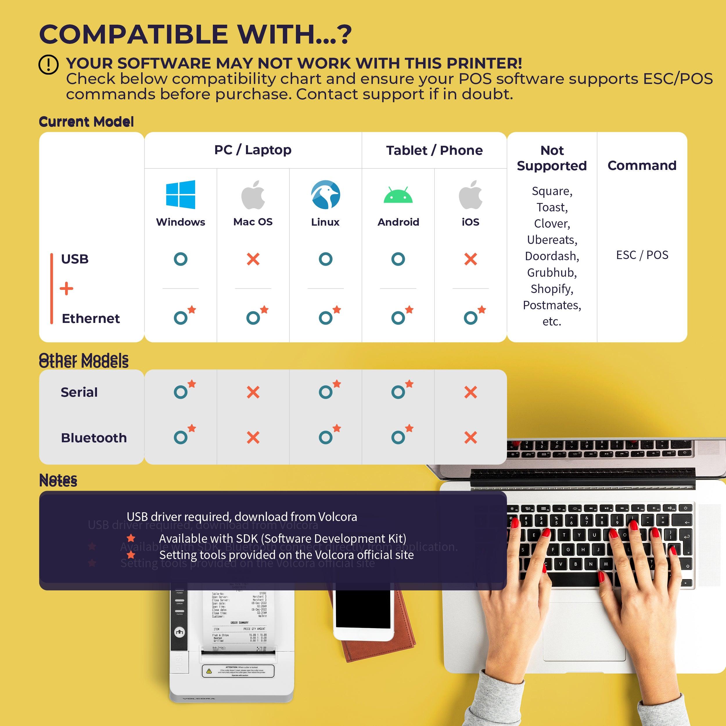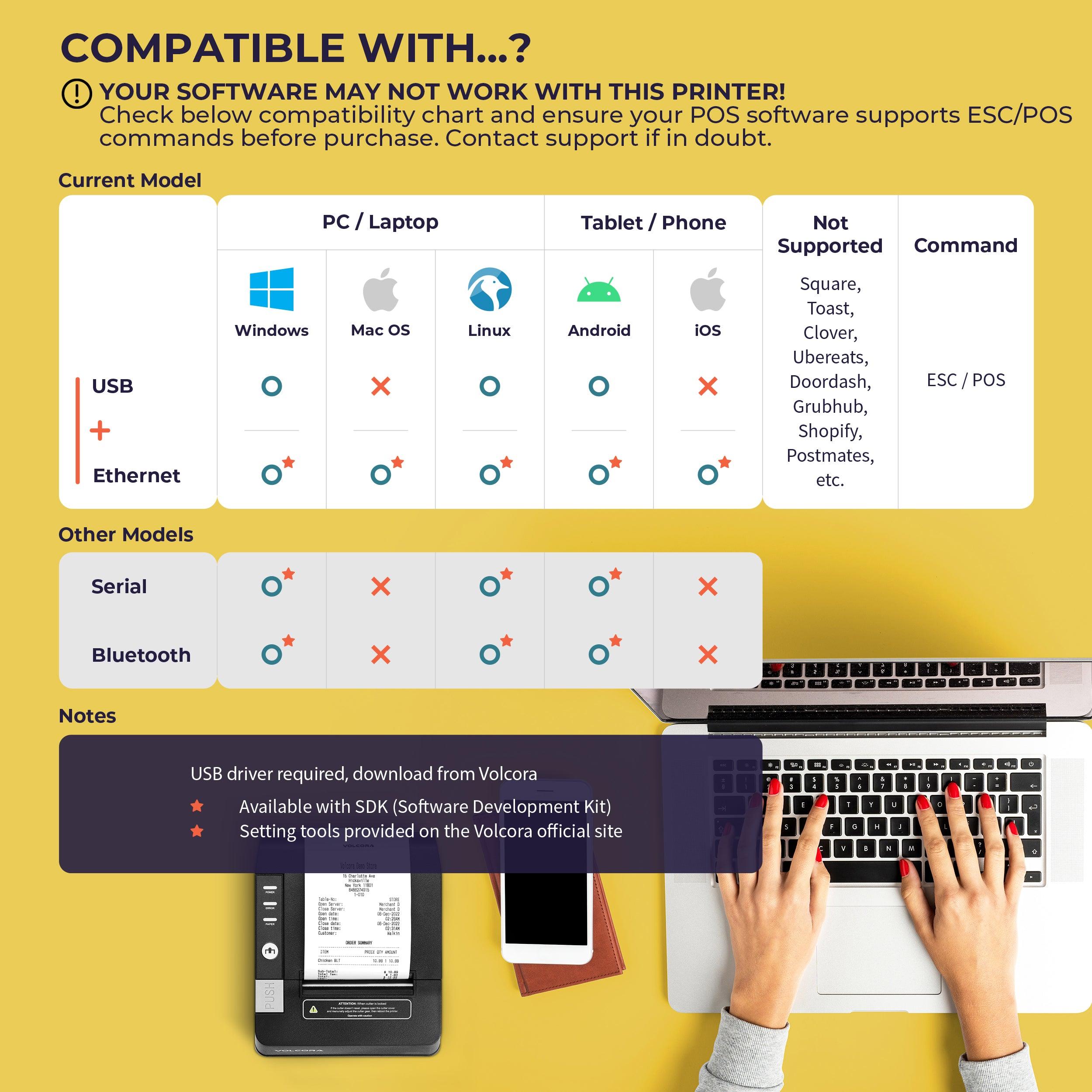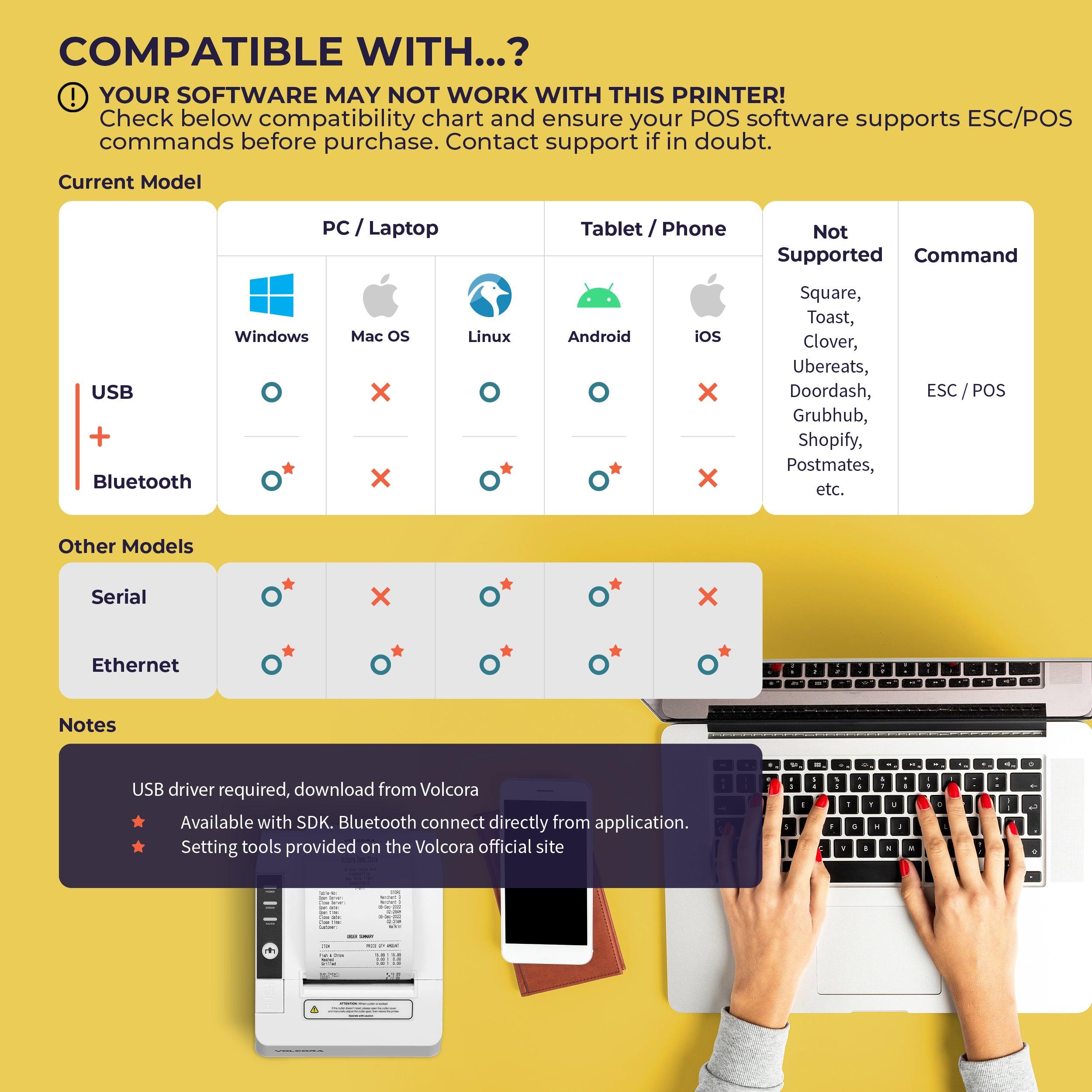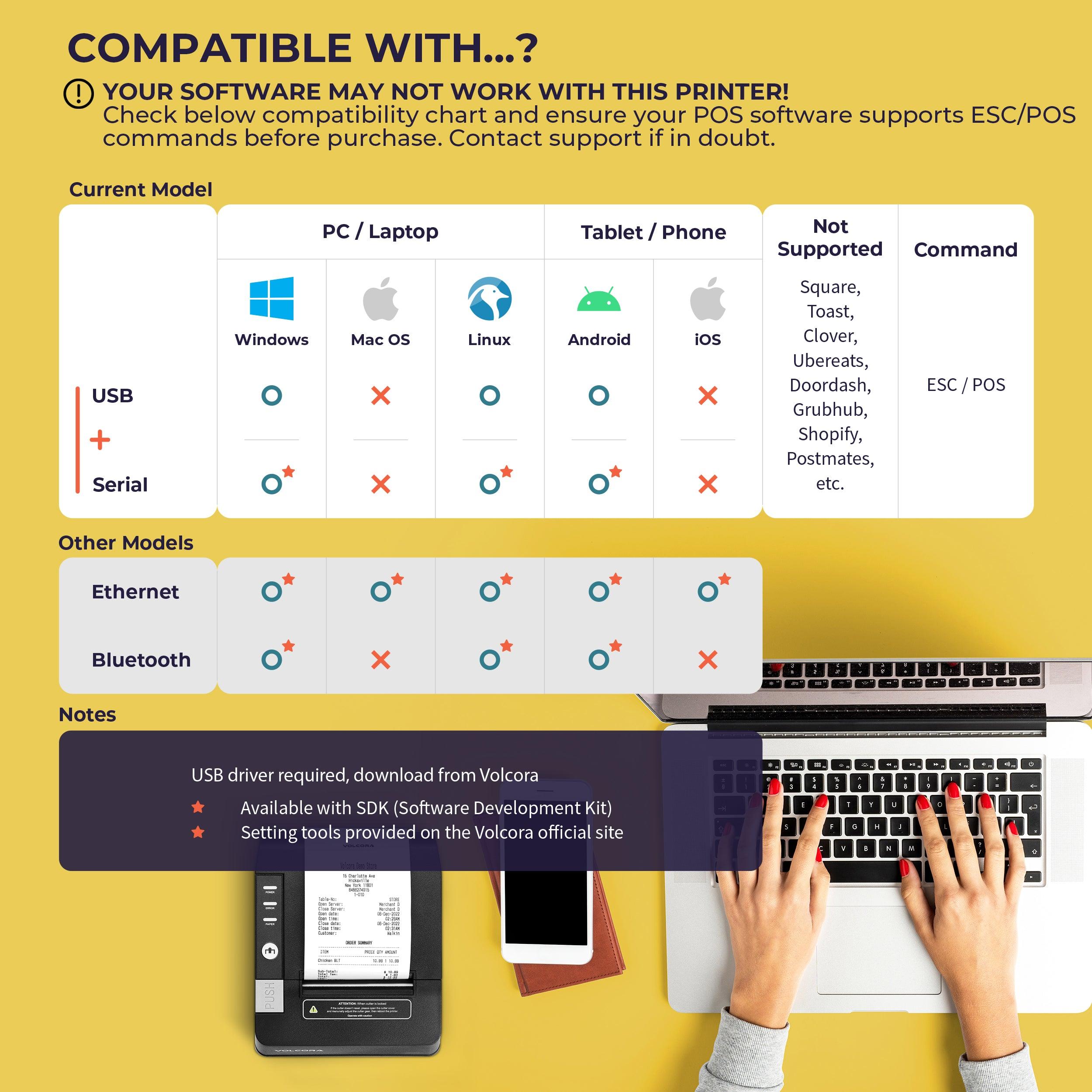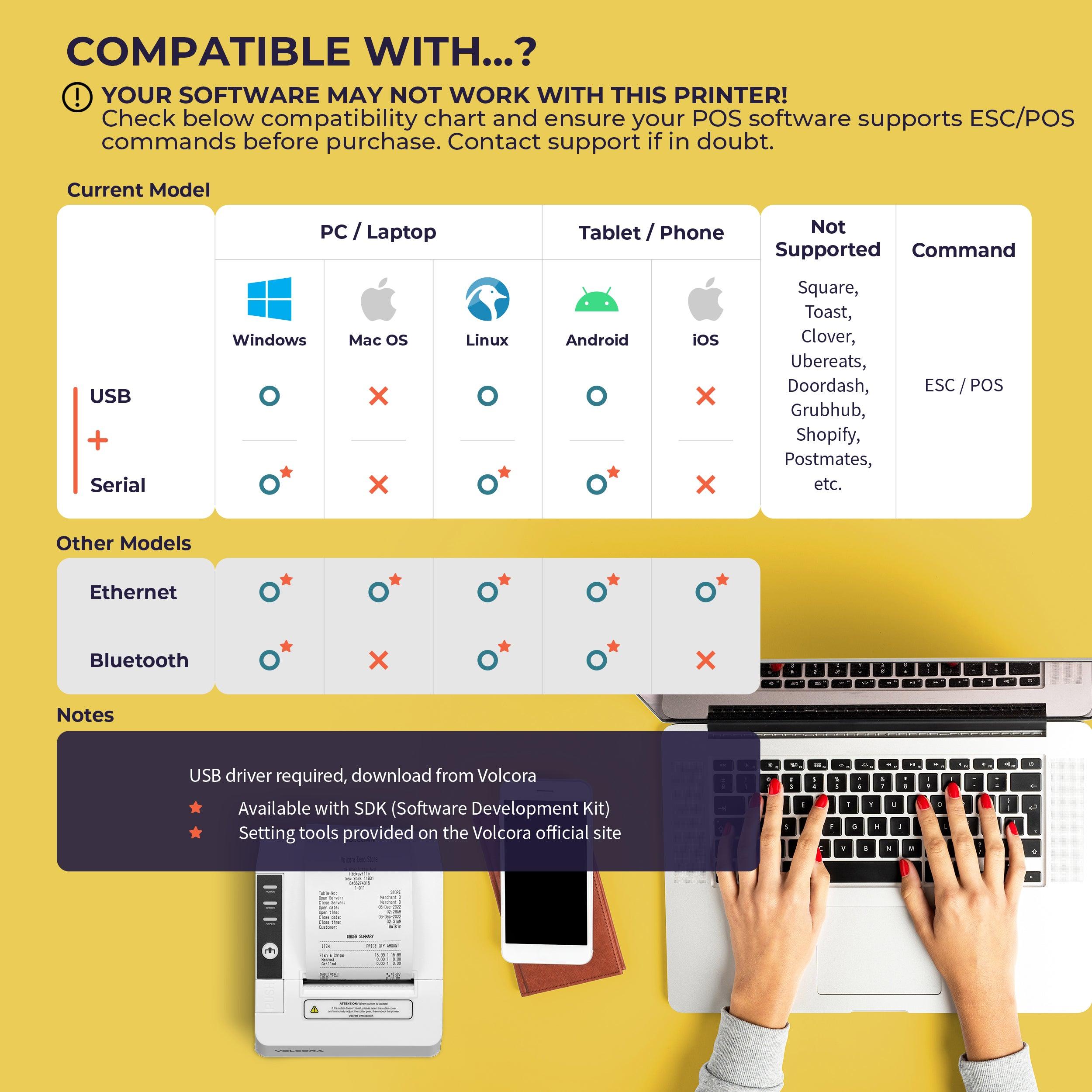 CONNECTION COMPATIBILITY: The provided USB connection supports Android, Windows, Linux and POS apps with standard printing commands ESC/POS. Android requires SDK development and our printer does not support Square, Clover or Toast POS applications. Ethernet and serial connection can transmit most commands without a driver and are compatible with most operating systems. Bluetooth connection supports standard commands ESC/POS