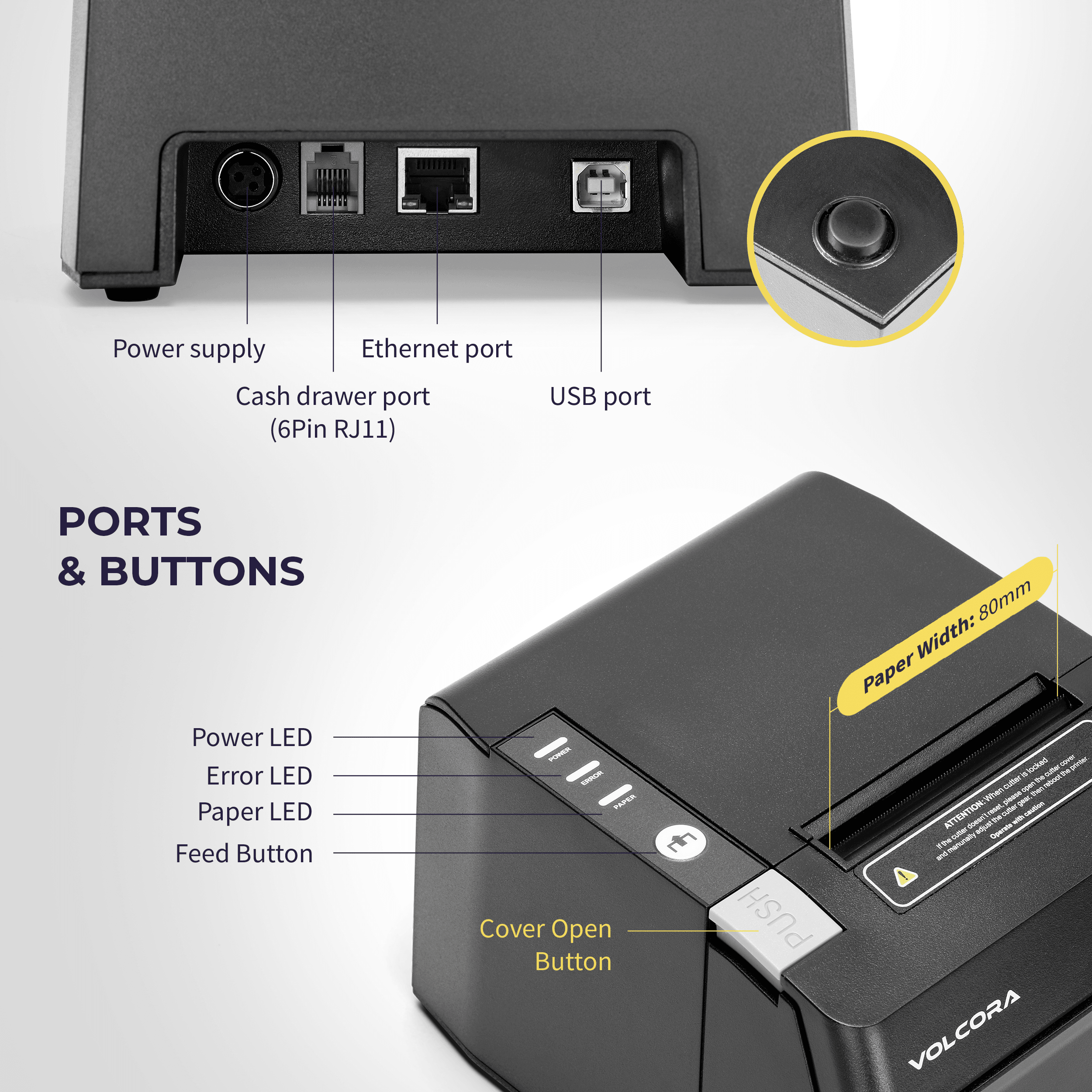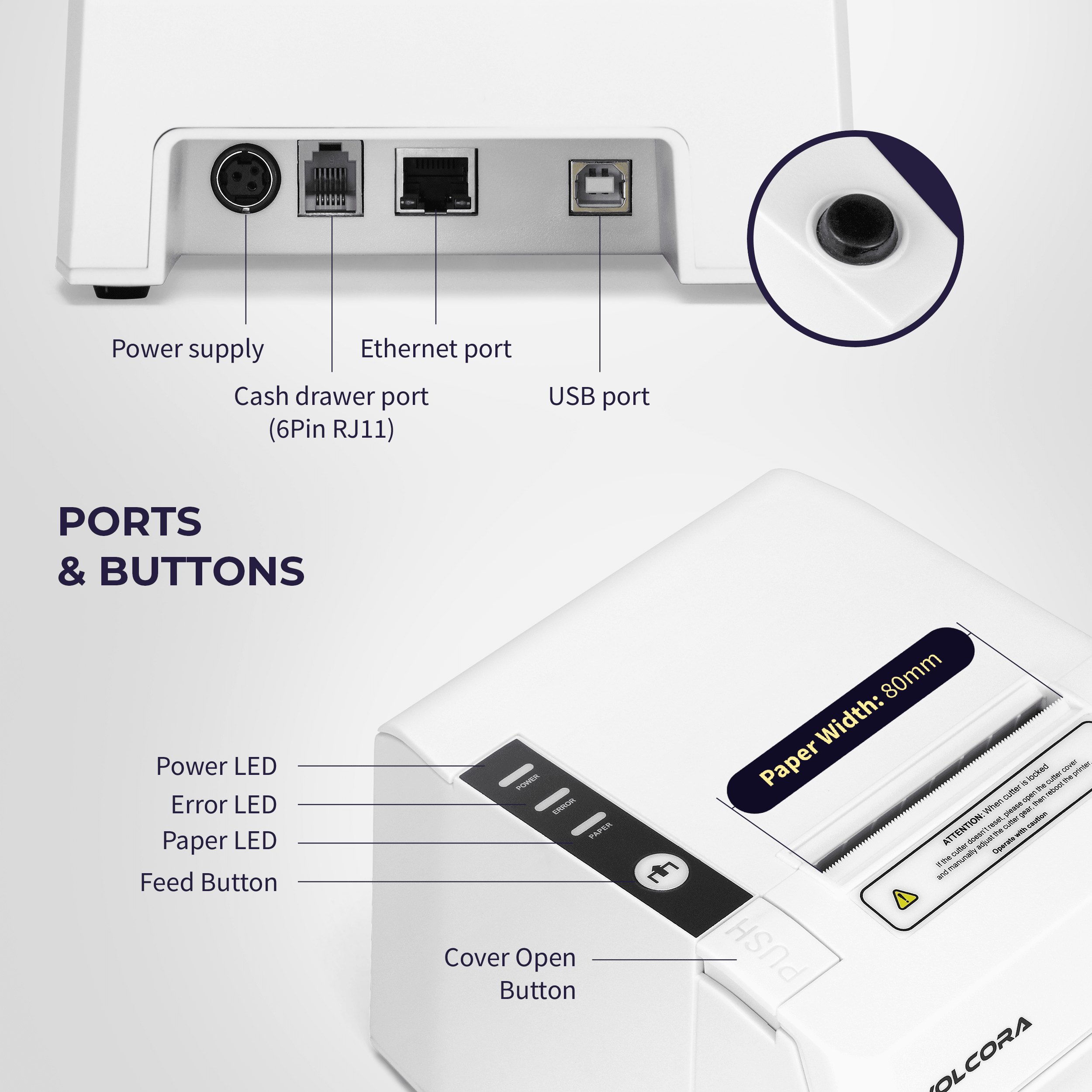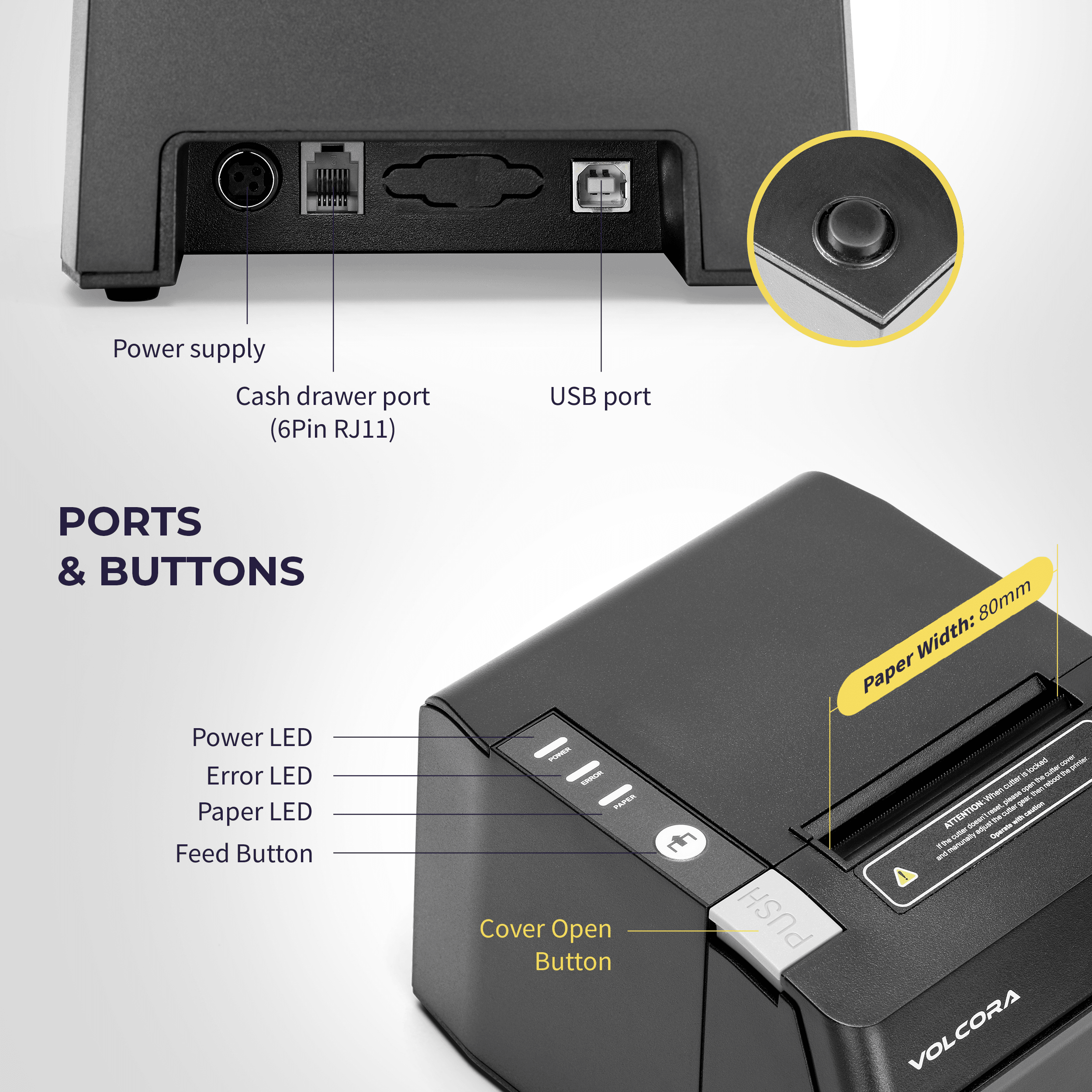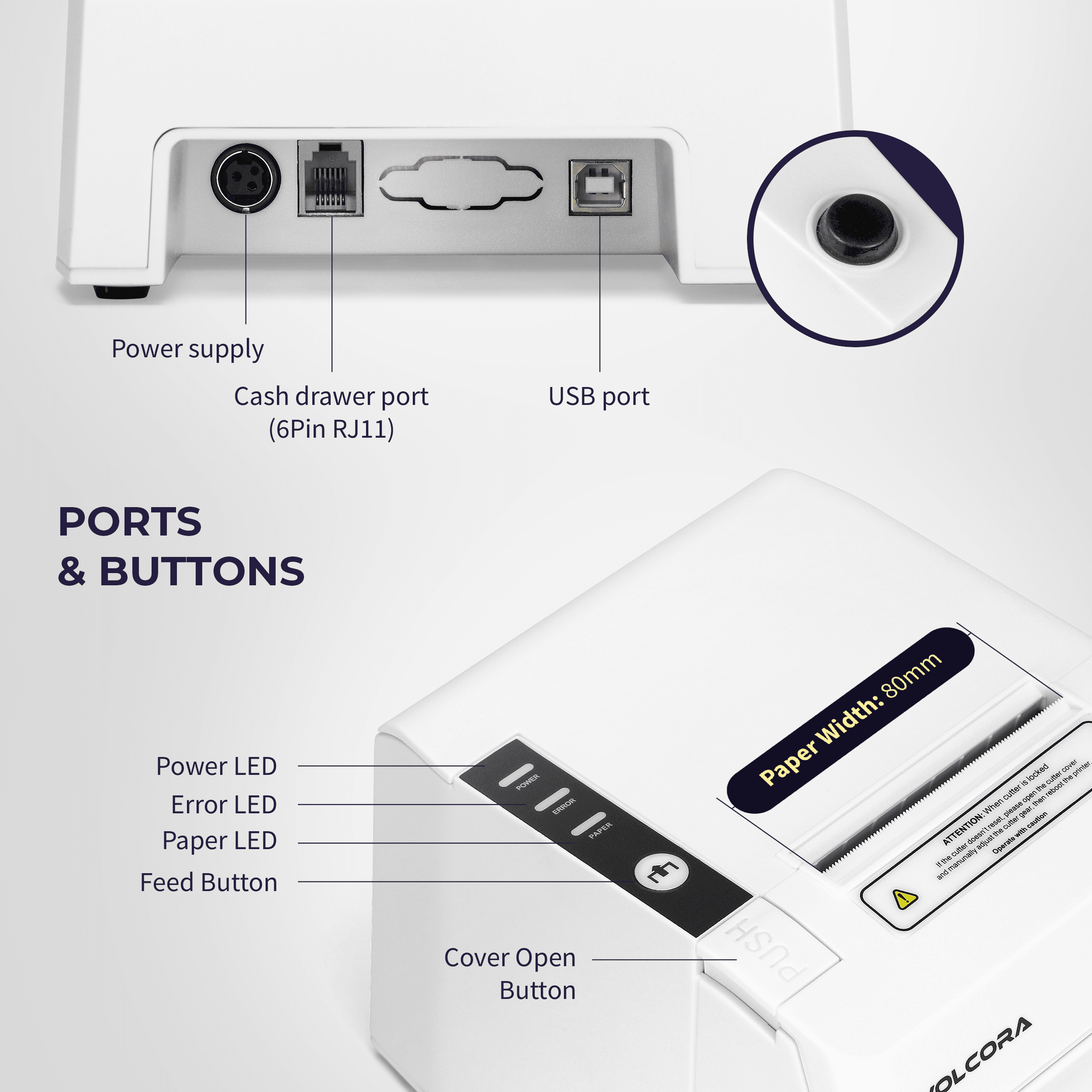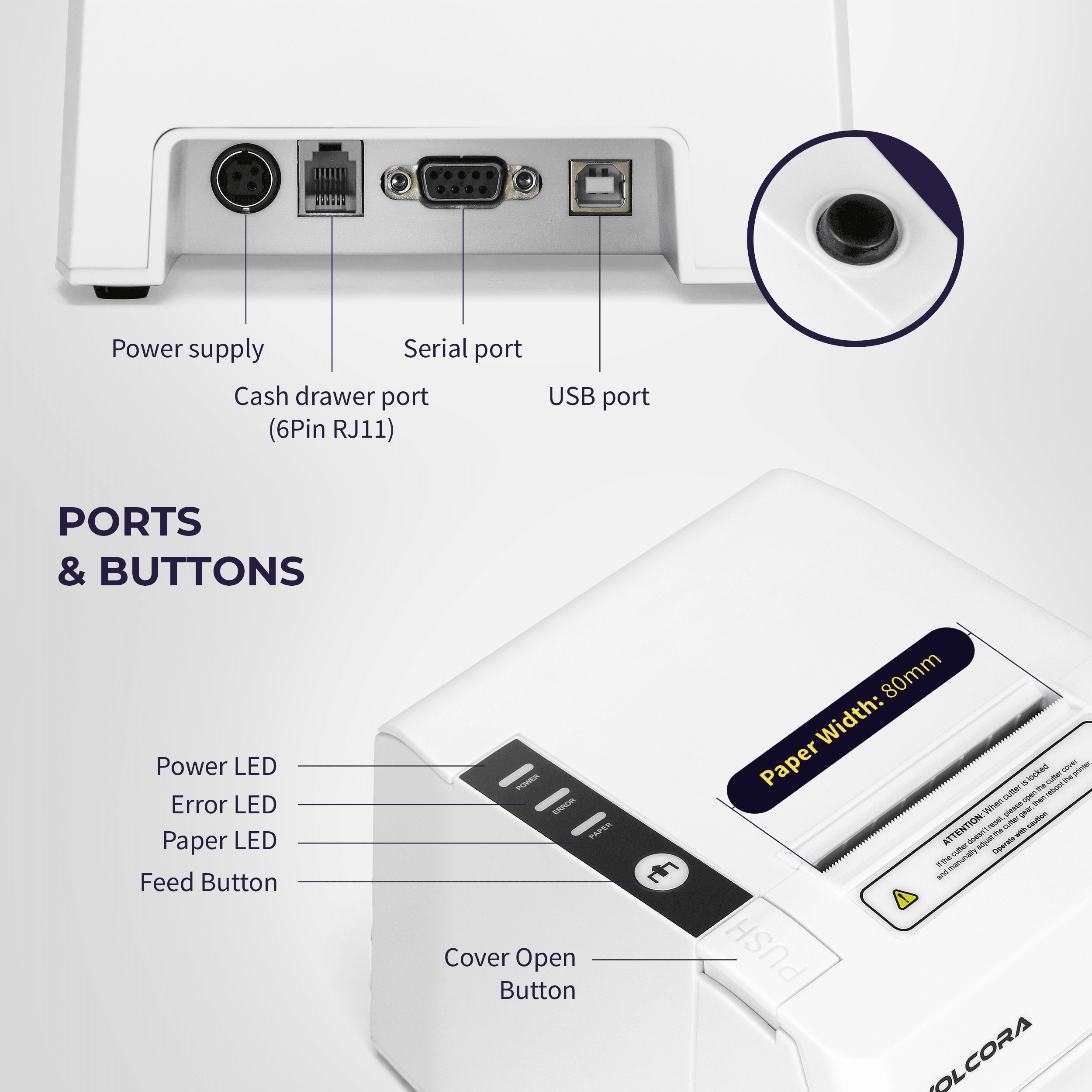 FAST PRINTING with AUTO CUTTER: Volcora's receipt printer uses thermal printing for maximum print speed of 220mm/sec. Auto paper cutter system automatically cuts receipt perfectly after each print. Our error proof design provides an error signal to user as well as paper feeding button and cover opening capability to fix any potential issues.