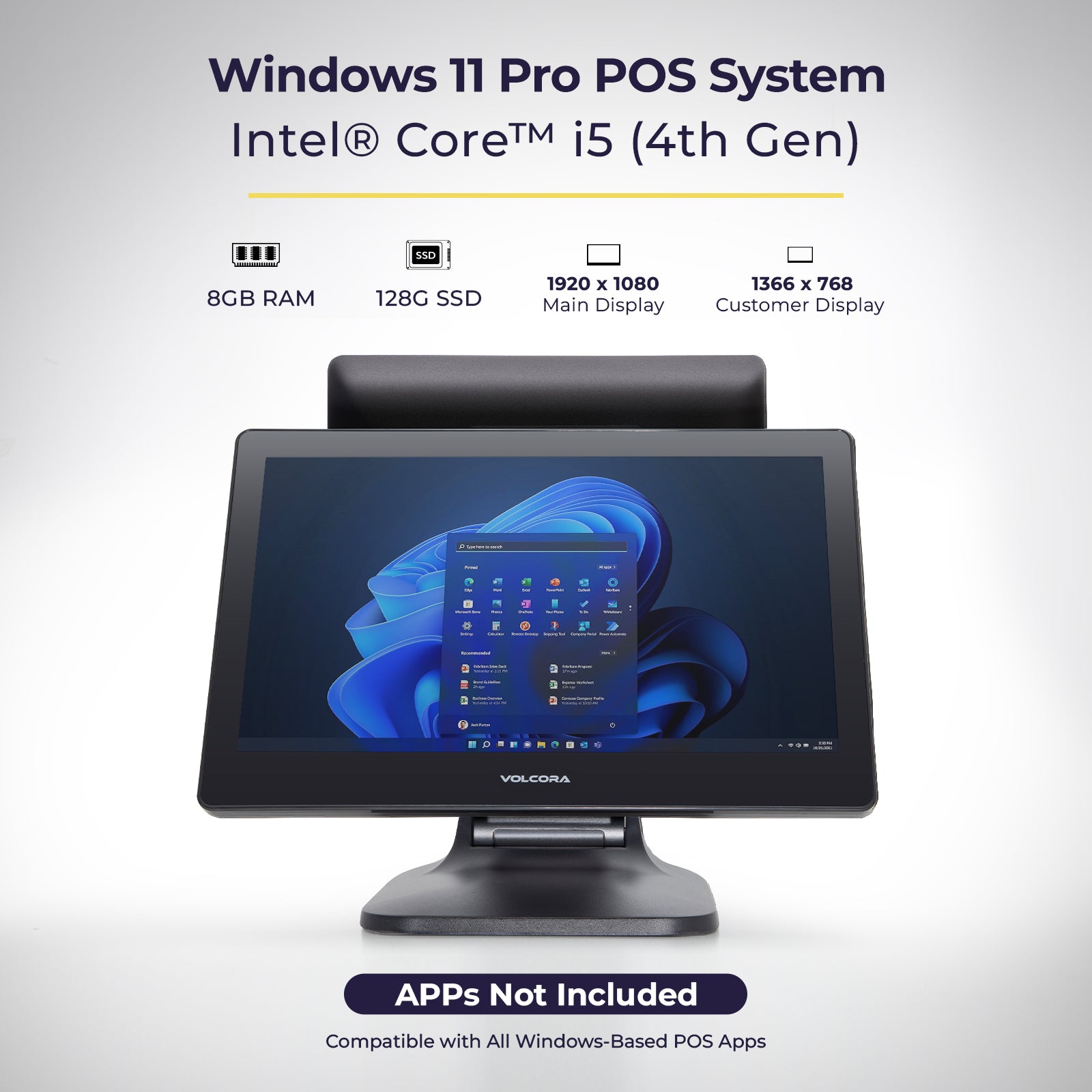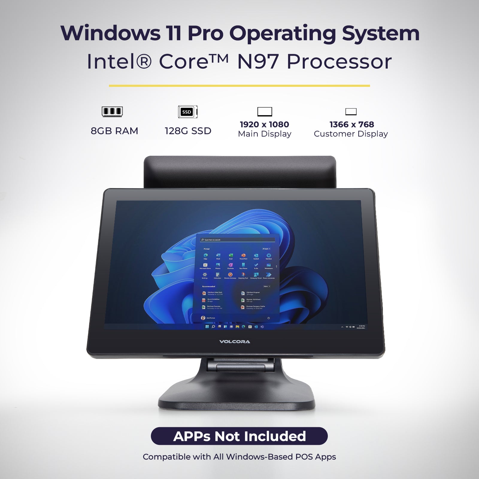 Windows 11 POS TERMINAL - Equipped with Intel i5-4310U or Fanless Intel N97 Processor, 8GB or 16GB Memory, and 128GB or 256GB Hard Disk. Built-in WIFI, Bluetooth, Speaker, AUX, USB 2.0, USB 3.0, HDMI, and Ethernet ports for all kinds of connectivity. Windows 11 Professional OS for a wide range of POS applications of your choice. (Terminals do not come with POS software.)