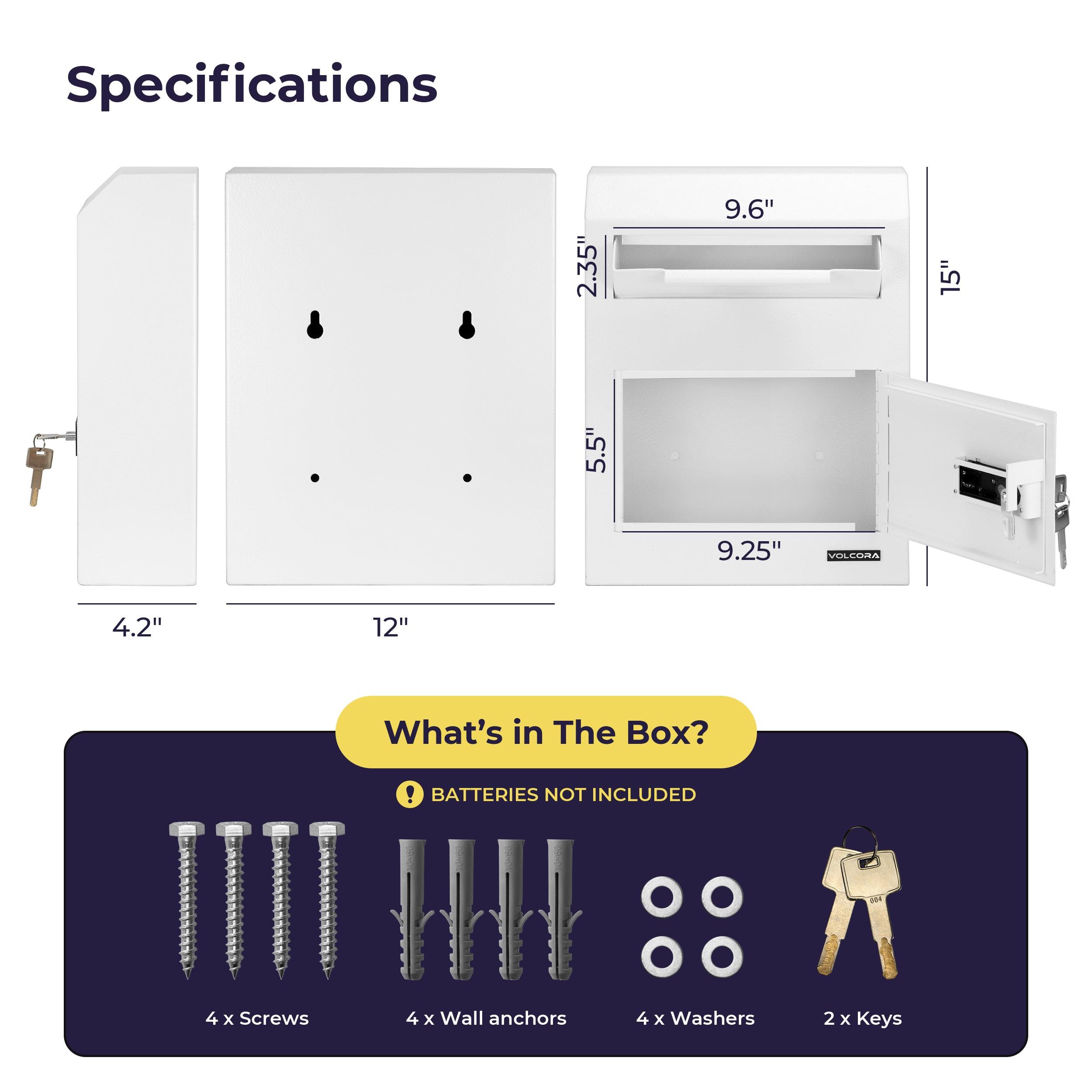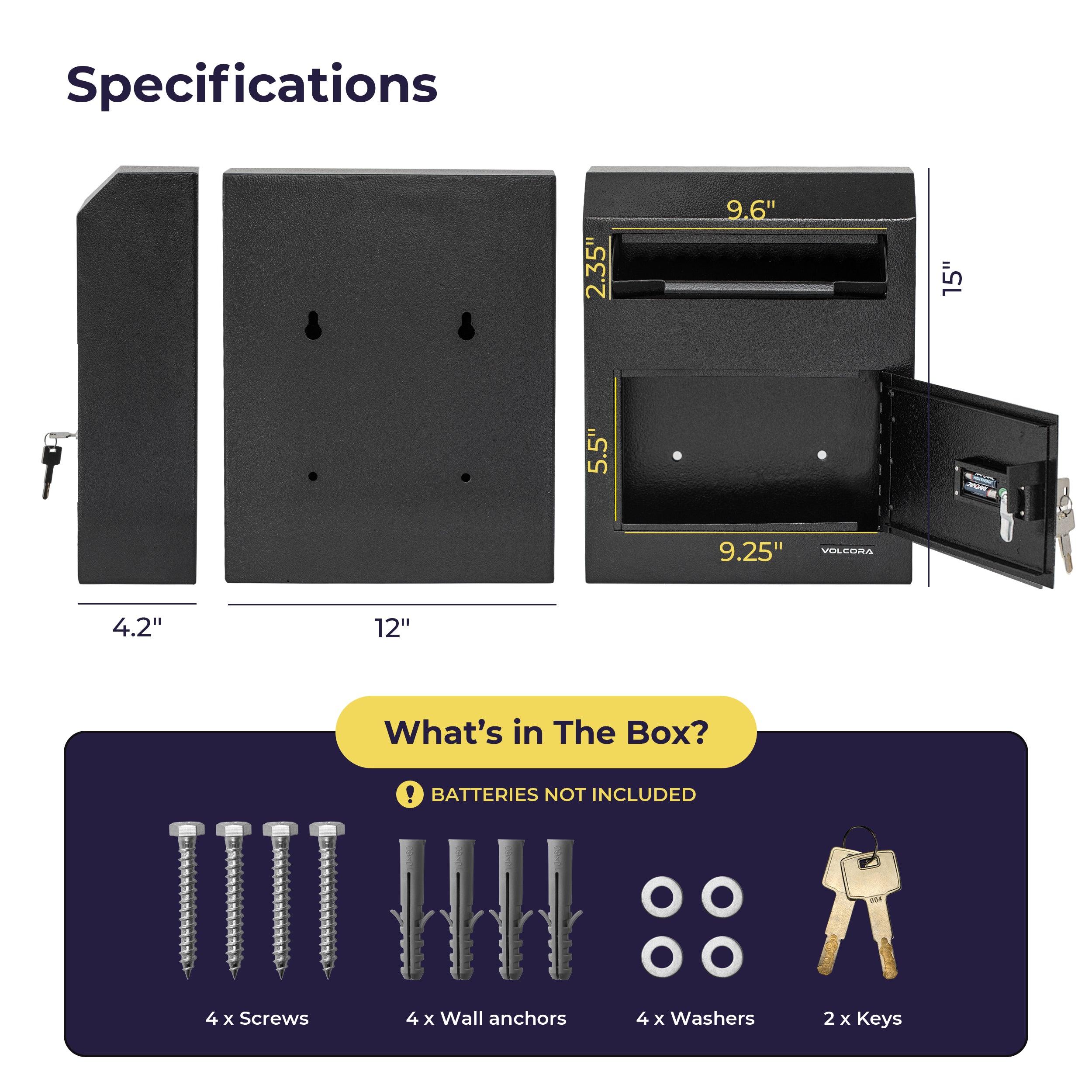 SECURE ELECTRONIC COMBINATION LOCK with KEY: Top security wall mounts locking drop box has a key lock and electronic combination lock with dual lock and unlock capabilities. 2x AAA Batteries not included.