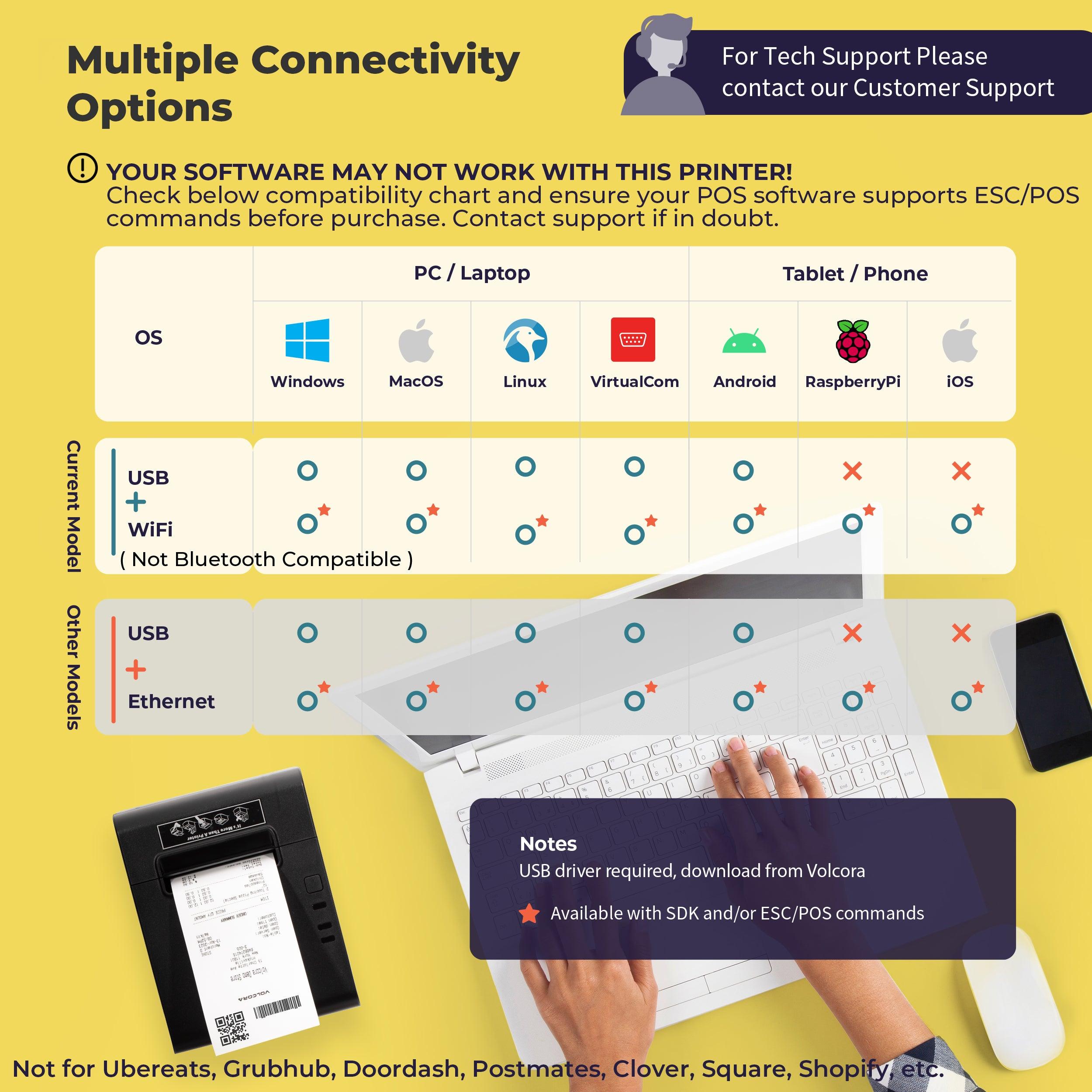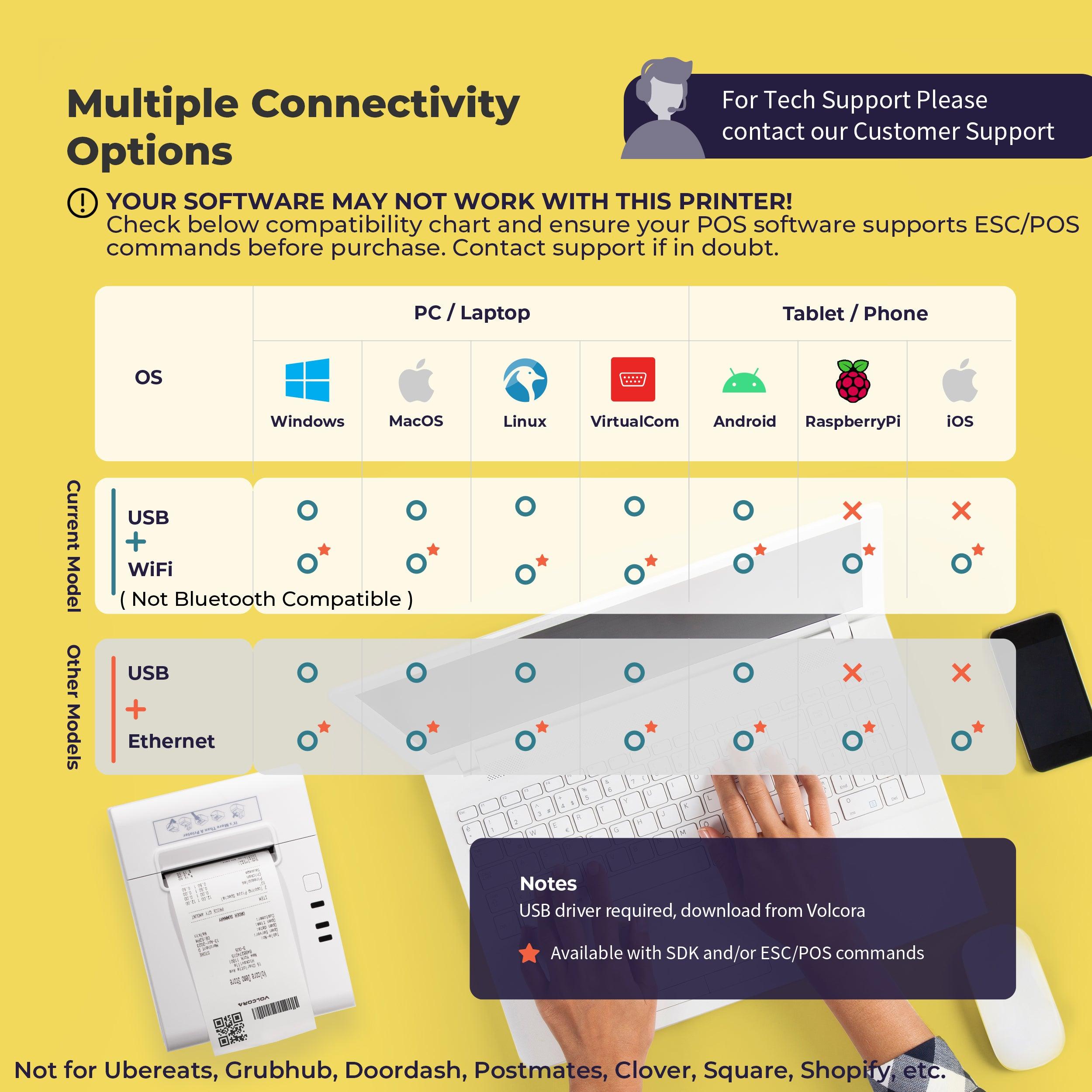 CONNECTION COMPATIBILITY - This wireless Wifi receipt printer is equipped with ESC/POS printing capability and can be used with Windows, Linux, MacOS, Raspberry, and Virtual Com via USB. A software development kit (SDK) is required for custom application development on Wifi-supported systems, including iOS and Android, which can be downloaded from Volcora. Please check further with your software for compatibility.